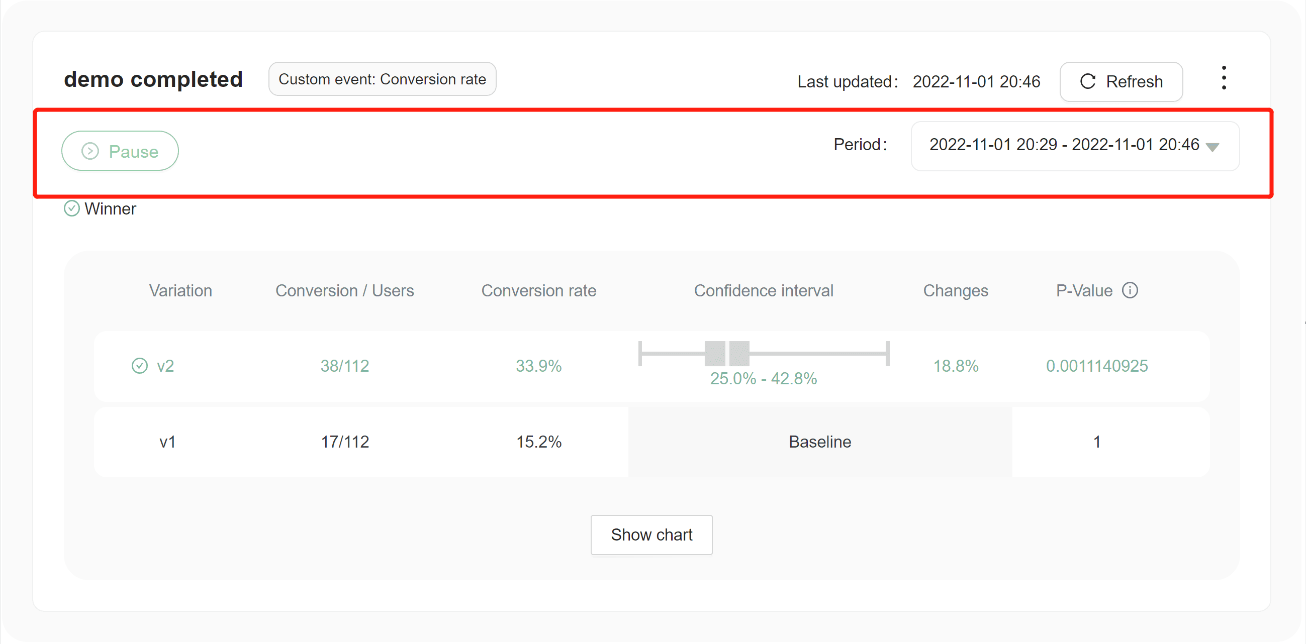 The winning variation for a completed experiment is the variation that is most likely to be the best option out of all of the variations tested. FeatBit indicates clearly which variation is likely to be the best option with an icon of green correct in a circle .png)