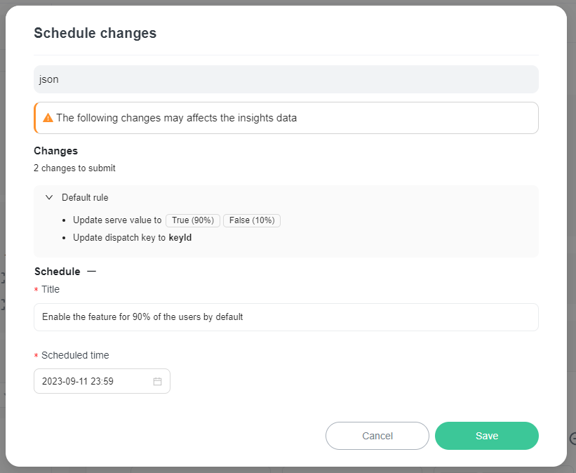 Scheduling flag changes lets you define and schedule changes to your flag’s targeting rules for future points in time. You can create a progressive delivery strategy by scheduling the incremental steps to release your feature to 100% of your user base.