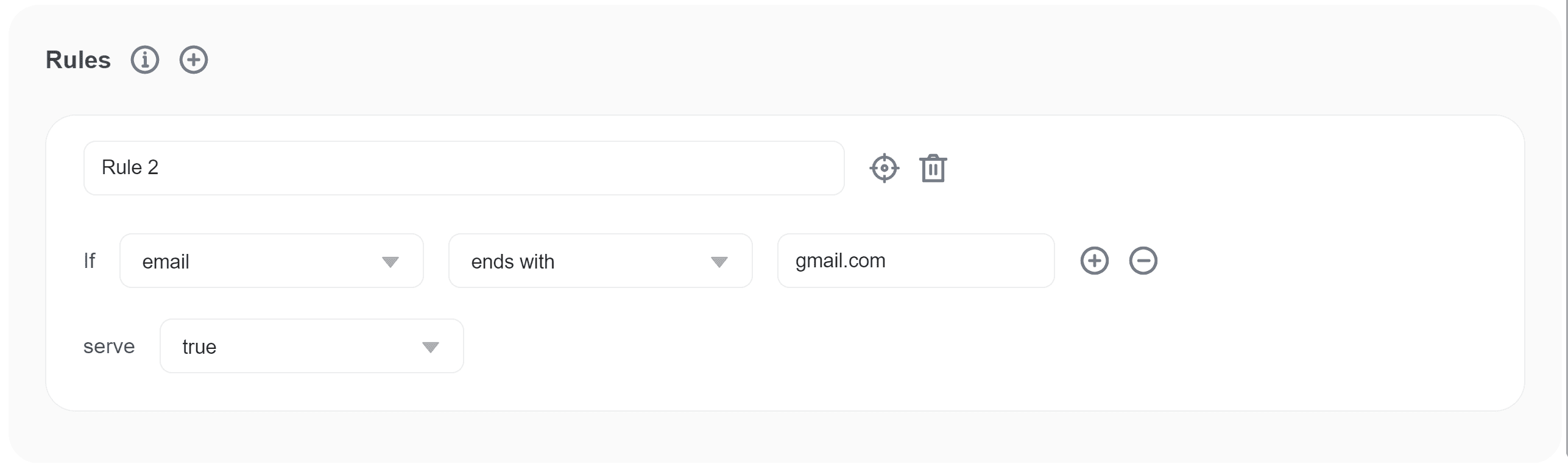To create a rule that serves true to all users whose email address ends with gmail.com: