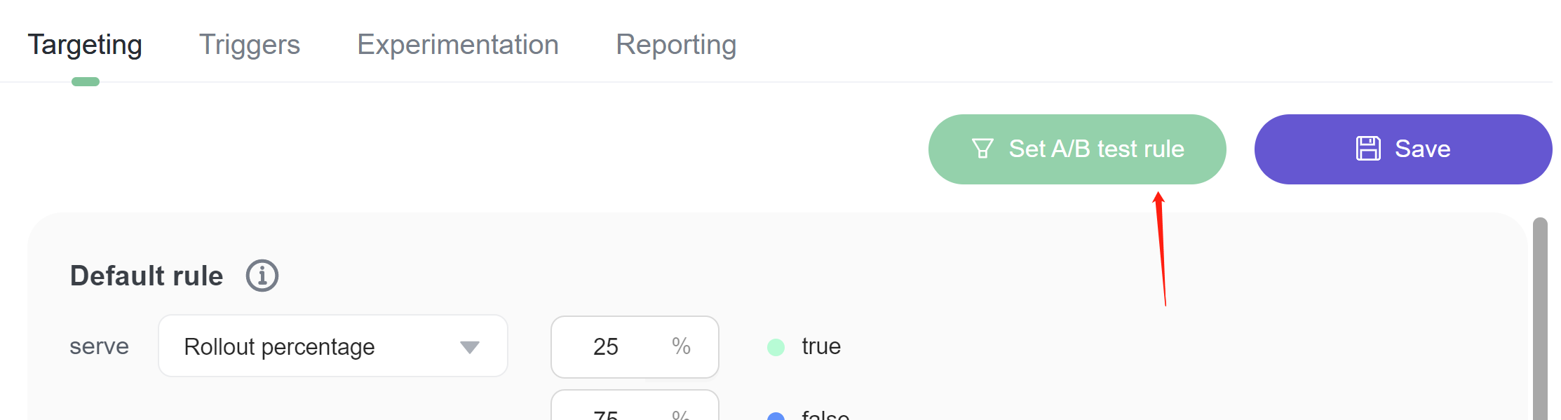 After you save a targeting rule, you can click the Set A/B test rule button to run an experiment on the rule. To learn more, read Creating experiments.