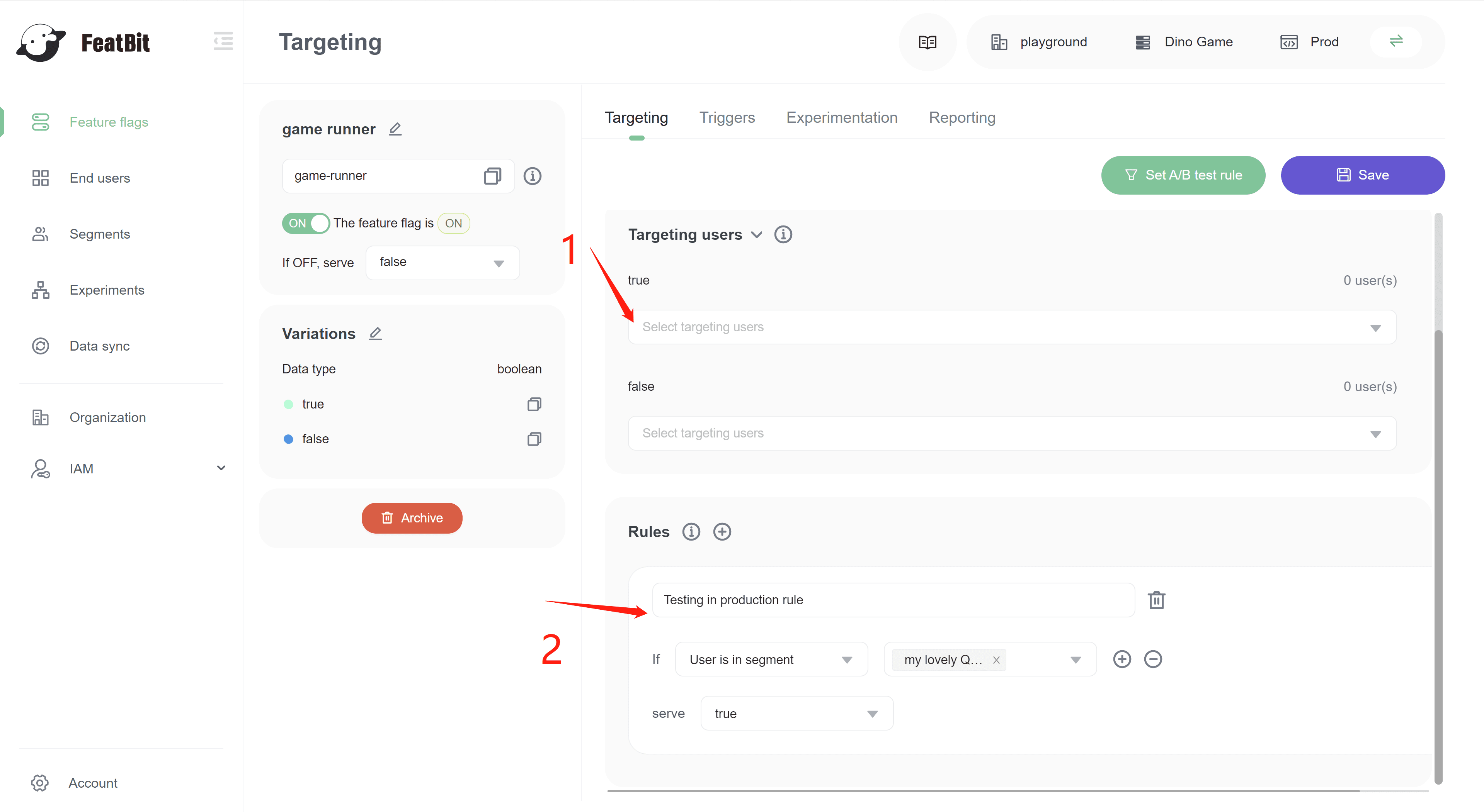 We go back to the feature flag list and open "game runner" feature flag's "Targeting" page.