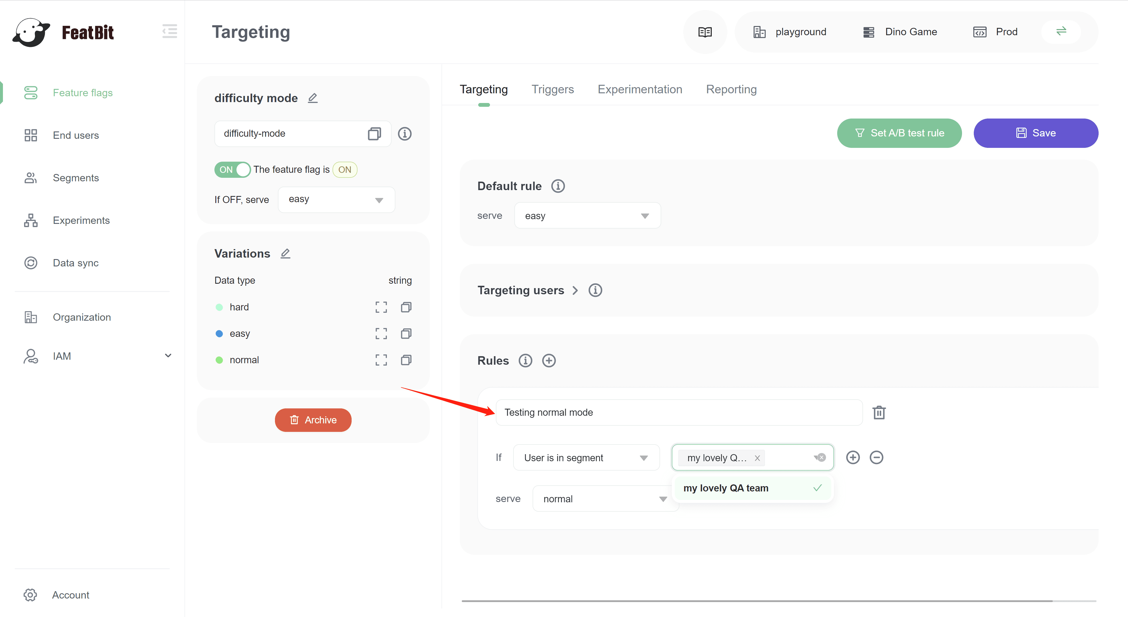 The configuration above means if users is in segment "my lovely QA team", DinoGame will release to this user. This configuration can also be implemented in other feature flags (opens in a new tab) for testing in production for other features, like "difficulty mode".