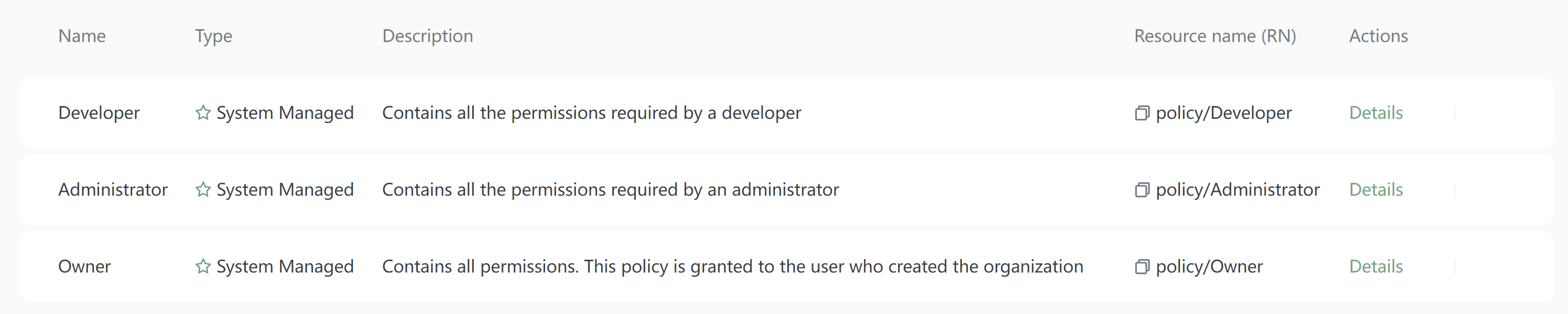 FeatBit provides three built-in policies which can't be modified. If needed, you can make a copy and modify it for your own needs.