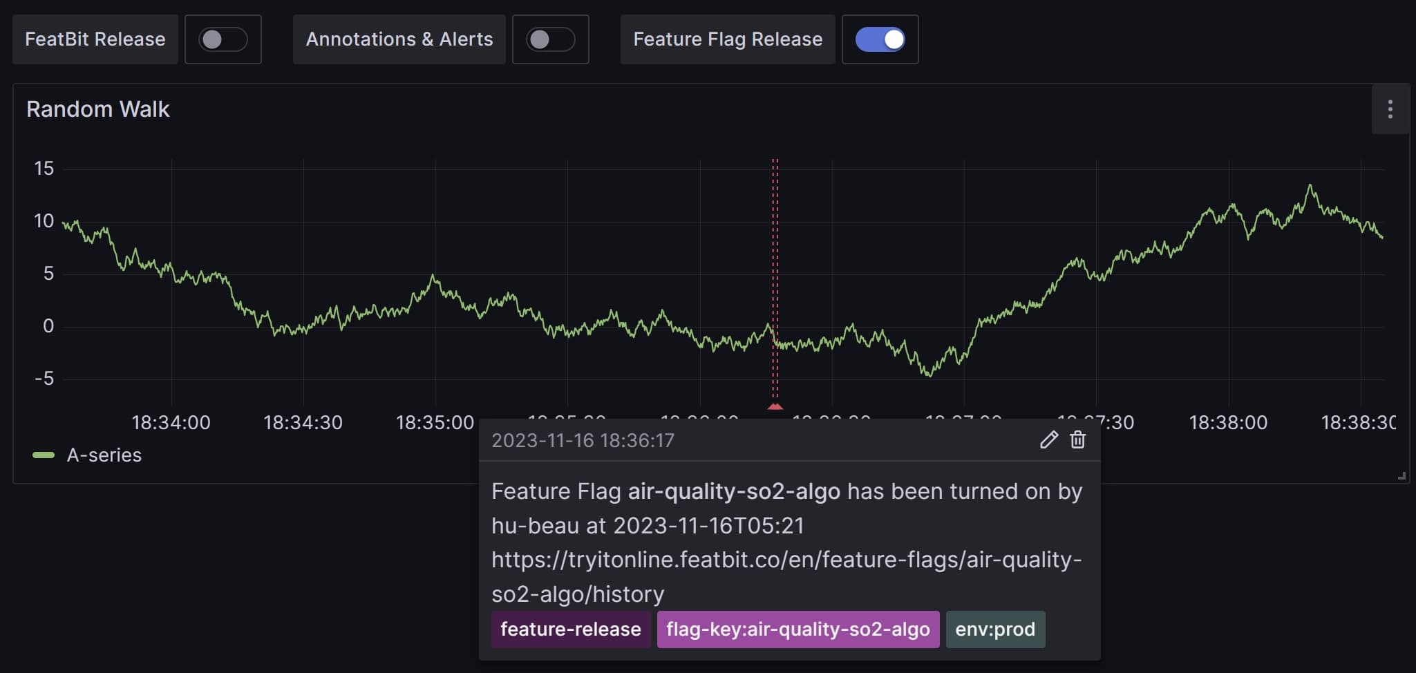 You can utilize FeatBit's Webhook integration to transmit updates about flags, environments, and projects to Grafana. These updates will appear as annotations, adding contextual information to your graphs. The figure below is an example: